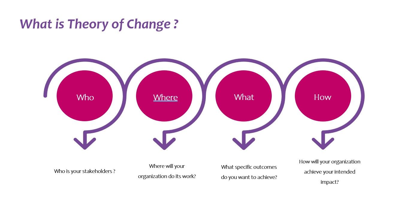 Η Θεωρία της Αλλαγής είναι ένα εννοιολογικό πλαίσιο που περιγράφει πώς και γιατί μια επιθυμητή αλλαγή μπορεί να επιτευχθεί μέσα από μια συγκεκριμένη επένδυση ή παρέμβαση. Βασίζεται στη λογική αλληλουχία μεταξύ εισροών (inputs), δραστηριοτήτων (activities), εκροών (outputs), βραχυπρόθεσμων και μακροπρόθεσμων αποτελεσμάτων (outcomes & impact).